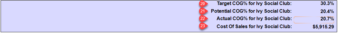 - Actual COG% for the Venue - Calculated - The value here is the real COG% after factoring in discounts and variance for that period of sales based on the Average Retail Price and the Average Potential Margin.